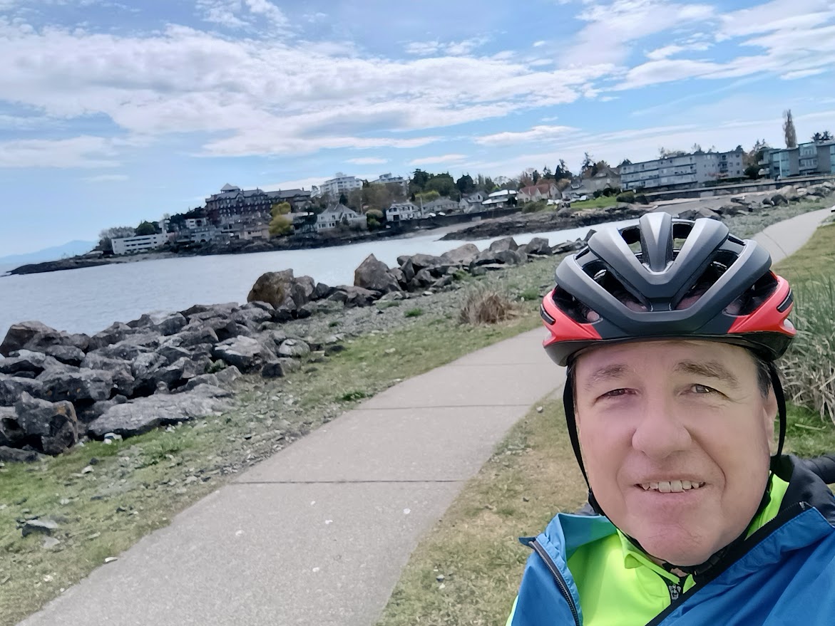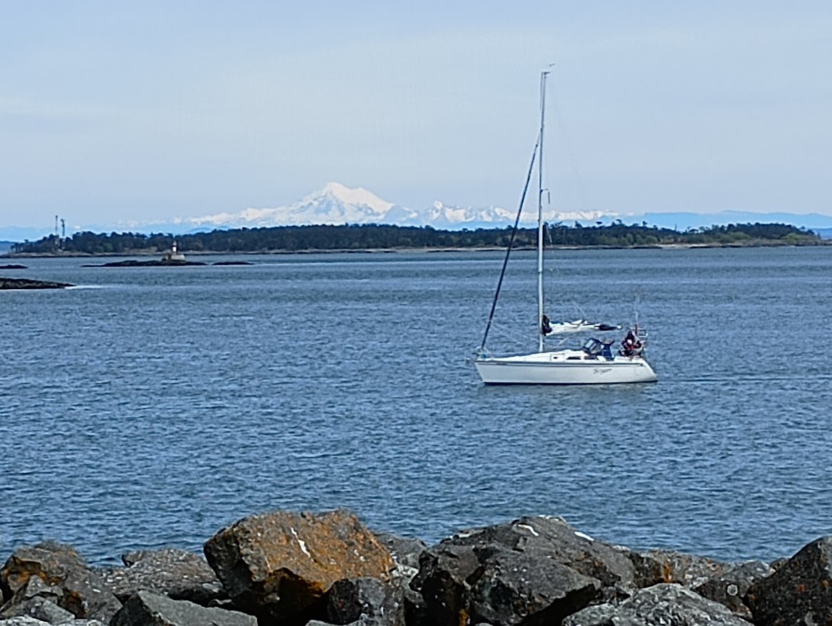The warmer and dryer weather is on its way finally. It was supposed to go to +20 today but with the wind out of the north I never took my vest off. And down by the sea it's always cooler. I rode north and then east to Willows beach and then over to the marina at Turkey Head. It was clear enough to see our local strata volcano, Mt. Baker, and many of the peaks of the Cascades in Washington. you can also see the Olympic mountains from that spot. The only thing you can't see from Victoria are Canadian mountains.